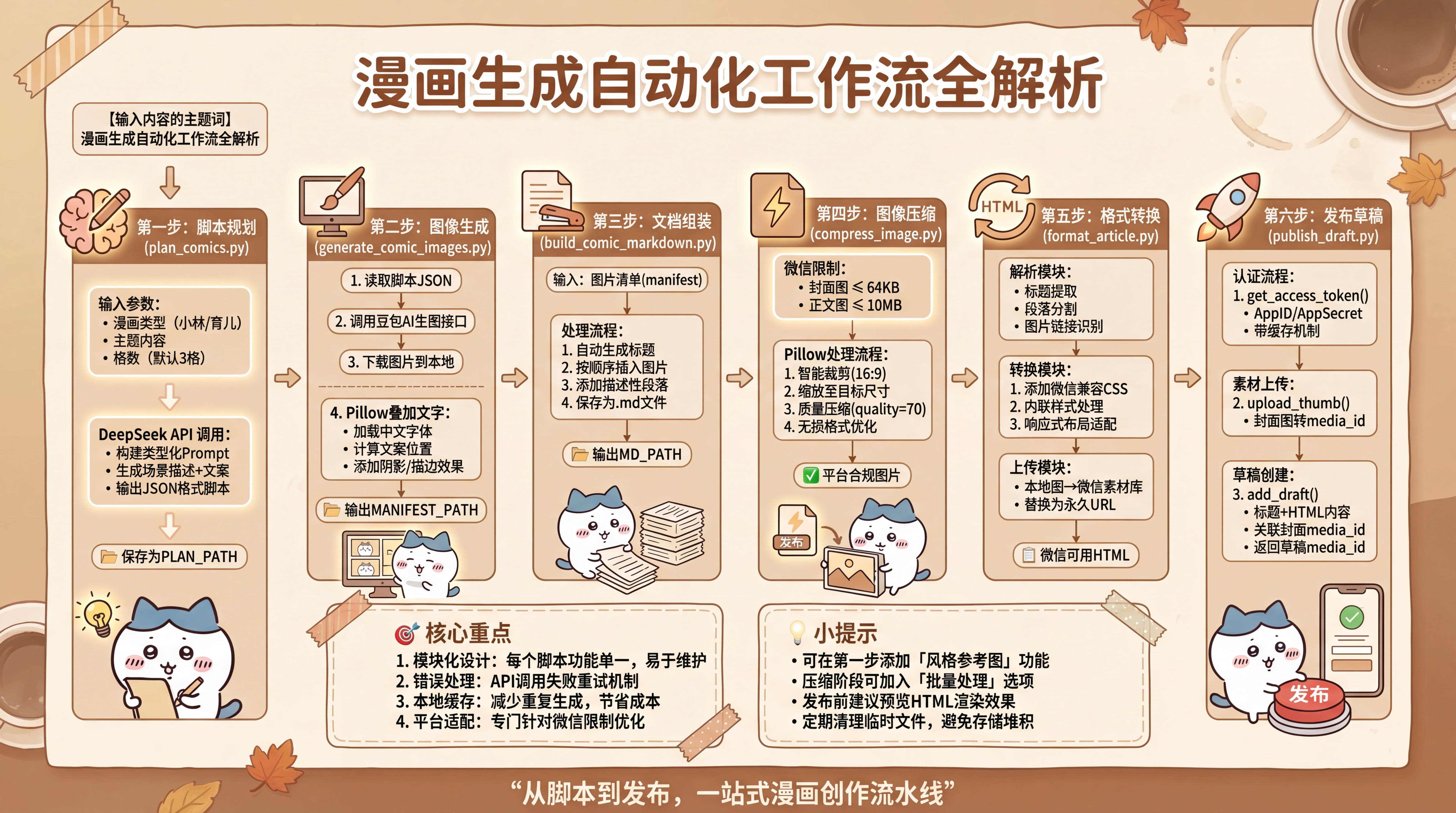 光有 SKILL.md 这个总指挥还不行,真正实现功能的是 scripts/ 目录下的 Python 脚本。我把整个漫画生成流程像流水线一样拆解成了多个独立的模块。它们的功能与依赖如下图所示: