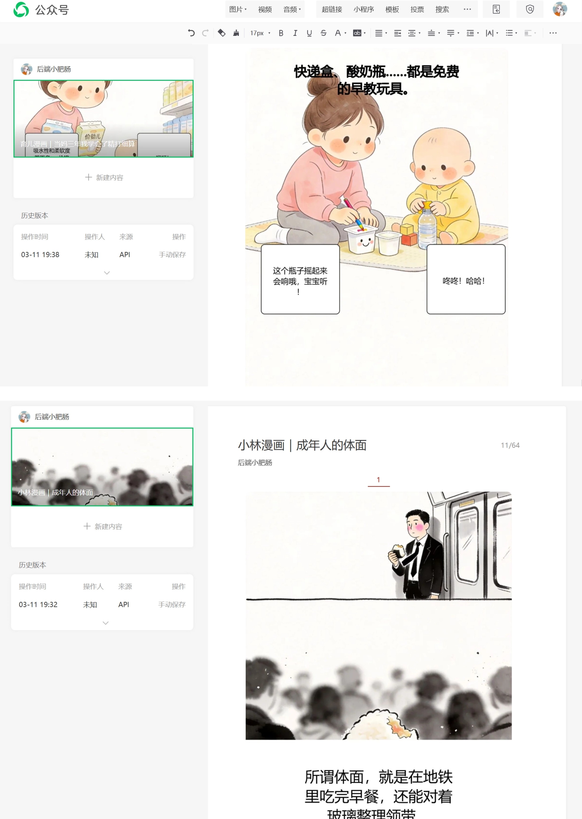 等待几分钟,育儿漫画或小林漫画就出现在了公众号草稿箱中: