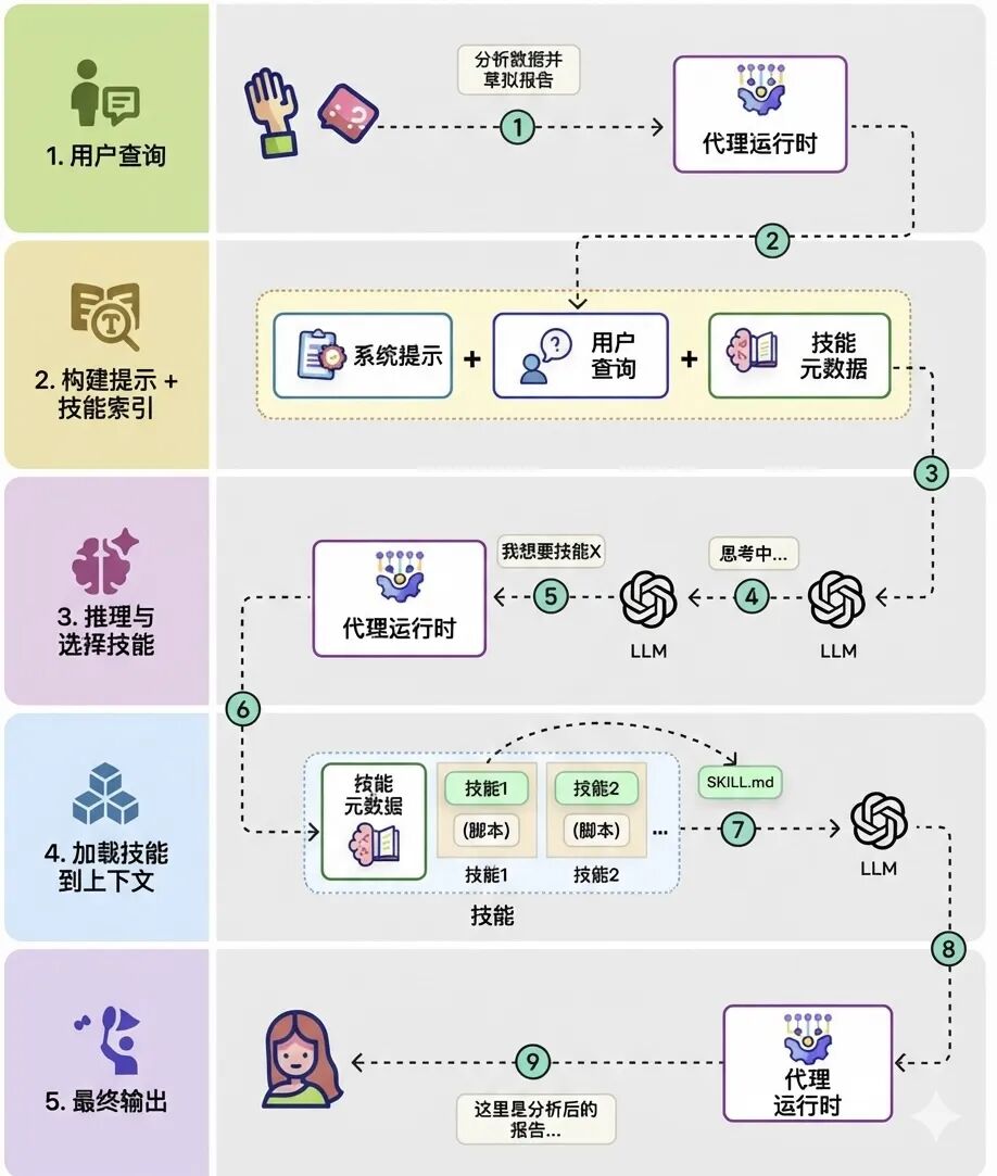 - 技能选择:通过阅读元数据,LLM 决定:“我需要‘数据分析技能(Skill X)’”。