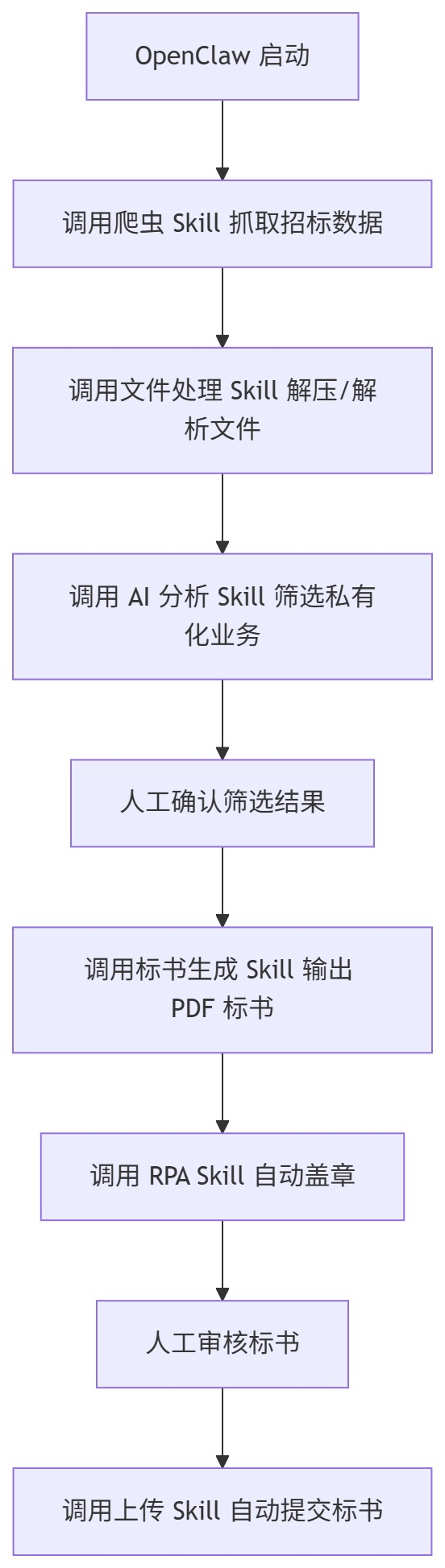OpenClaw 能完整实现「招标数据抓取→标书生成→盖章上传」全流程自动化,核心是通过扩展 Skill 对接爬虫、文件处理、AI 分析、RPA 等能力;