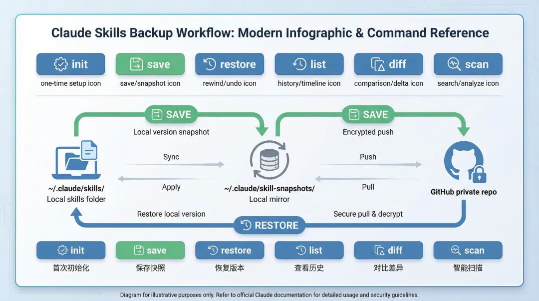 数据流是这样的:你本地的技能文件夹(~/.claude/skills/)通过 save 命令同步到 GitHub 私有仓库,需要恢复时再通过 restore 命令拉回来。中间有一个本地镜像(~/.claude/skill-snapshots/)作为中转站。