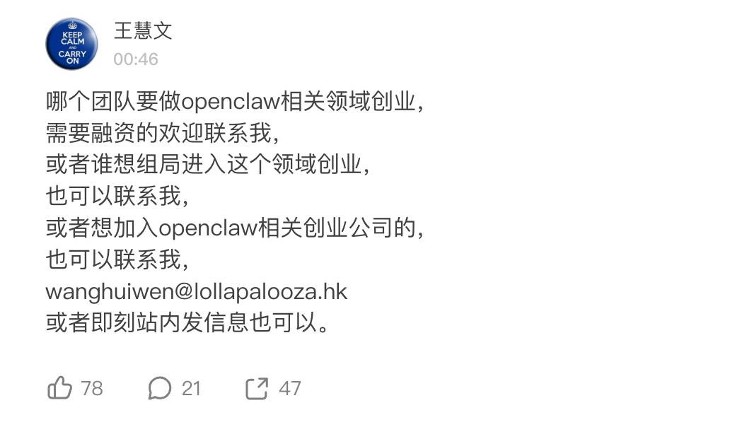 2026年2月7日,凌晨——这位曾经的“出海大王”又发了一封英雄帖。时隔三年,王慧文(美团联合创始人)在即刻上发文,宣布倾注全力关注一款名为Clawdbot(现改名为OpenClaw)的AI Agent项目。