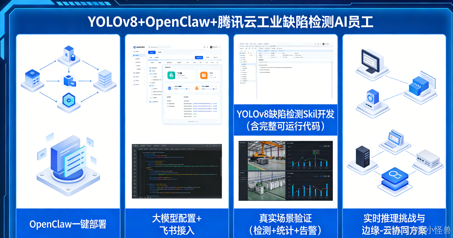 一直致力于降低CV技术门槛,今天带来一期硬核实战——用YOLOv8+OpenClaw+腾讯云,30分钟打造一个能24小时盯流水线、发现划痕就报警、自动统计不良率的AI员工。
