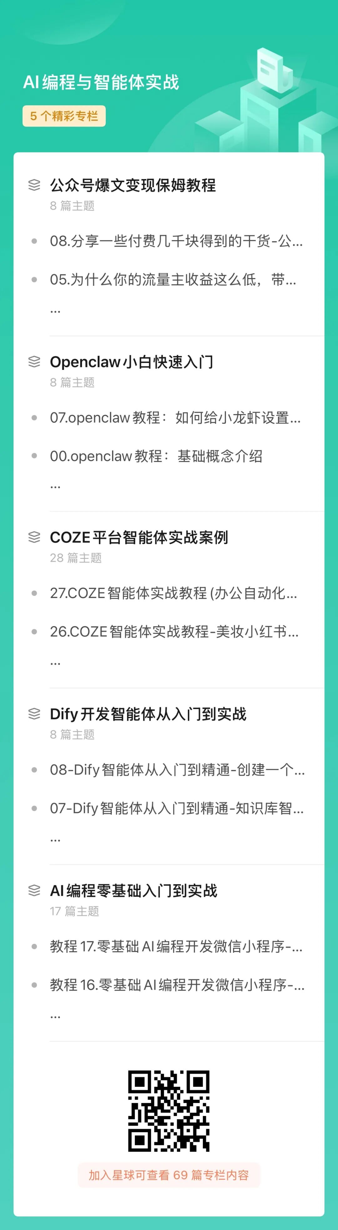 目前我们星球是有全套的AI编程和智能体的教程,openclaw教程(可以学1整年),有兴趣的可以看看。我自己也在全力深耕这个赛道,欢迎志同道合的小伙伴加入我们!