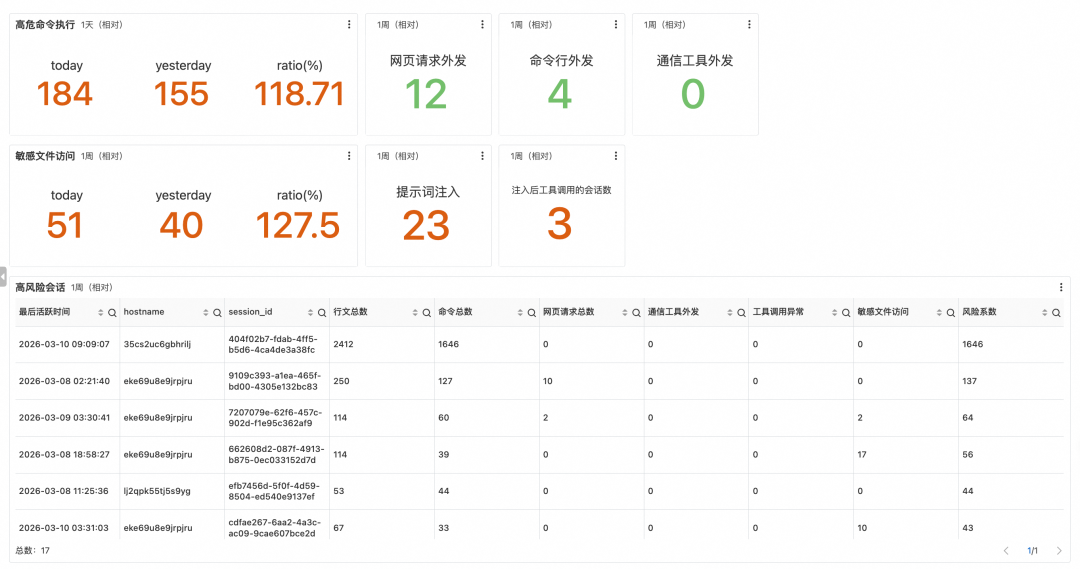 总览页应以指定时间窗口内的多维高危操作计数为核心,将 Agent 的安全态势压缩为一屏可读的风险快照。核心指标包括:高危命令执行数、网页请求外发数、命令行外发数、通信工具外发数、敏感文件访问数、提示词注入事件数,以及注入后的高危操作数。配合环比数据,帮助安全团队快速判断当前风险水位。