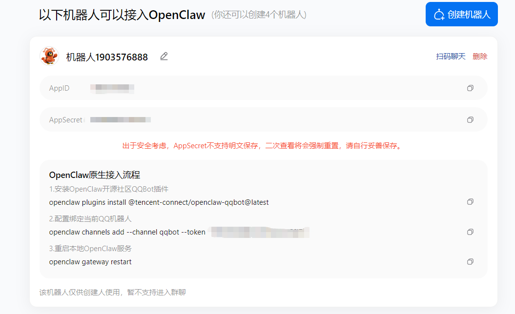 机器人创建完成后,复制 “AppID” 和 “AppSecret” 两个