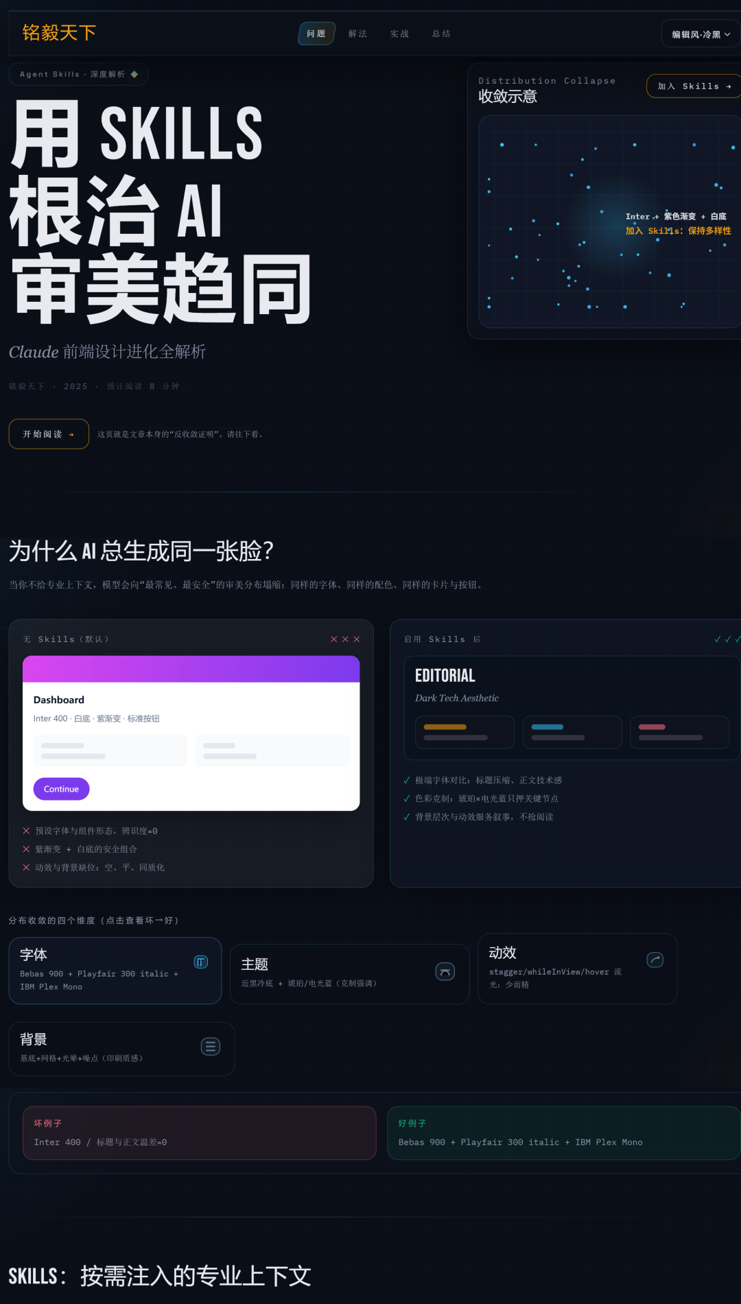 当你需要做前端设计,召唤 Frontend Design Skills,他就变成了一个专门研究过高端界面设计的专家——他知道该避开什么(Inter、紫色渐变),该用什么(特色字体、强烈对比、有层次的背景),以及怎么用(何时加动效、如何排版)。结果就是这篇文章对应的网站——近黑色背景,Bebas Neue 大标题,琥珀色 × 电光蓝的克制用色,三层背景叠加,逐字符入场动效,整体是"编辑风 × 暗黑技