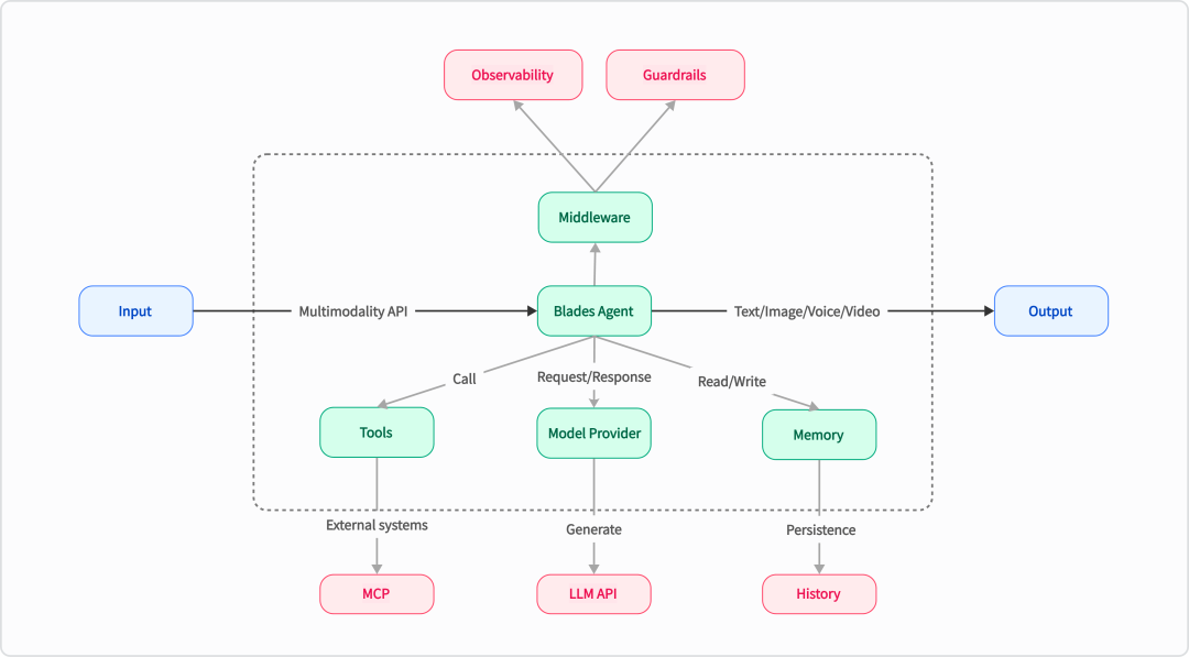 为了解决这个挑战,今天我带着我的新作品来了,它就是 Blades ! Blades 是一个专为 Go 语言设计的、用于构建 AI Agent 应用的现代化框架。目处于初期阶段,当前已支持自定义模型、工具、记忆体、中间件等功能,适用于多轮对话、链式推理和结构化输出等场景。它保持着 Kratos 一贯的设计美学,结合 Go 语言的特性,提供了灵活且高效的 AI Agent 解决方案。