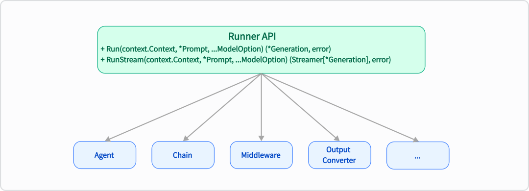 // Runner represents an entity that can process prompts and generate responses.type Runner interface { // Run 执行一个同步的、非流式的操作,返回一个完整的 Generation 结果。 Run(context.Context, *Prompt, ...ModelOption) (*Generation, error) // RunStream 执行一个异步的、流式的操作,返回一个 Streamer,用于逐步接收 Generation 结果。 RunStream(context.Context, *Prompt, ...ModelOption) (Streamer[*Generation], error)}