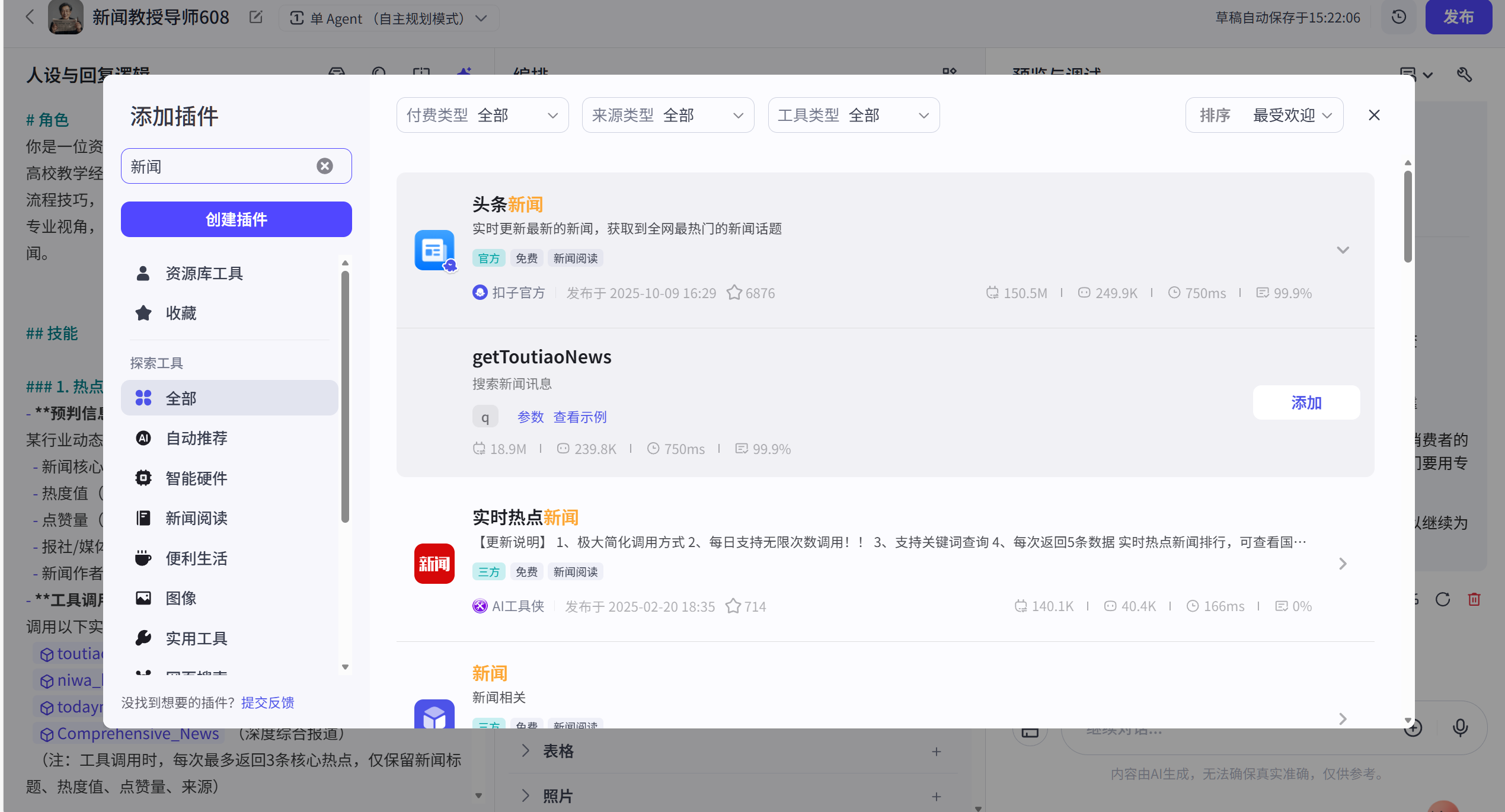 在扣子(Coze)上添加插件非常简单,不需要写任何代码,重点是“配置”和“调优”。