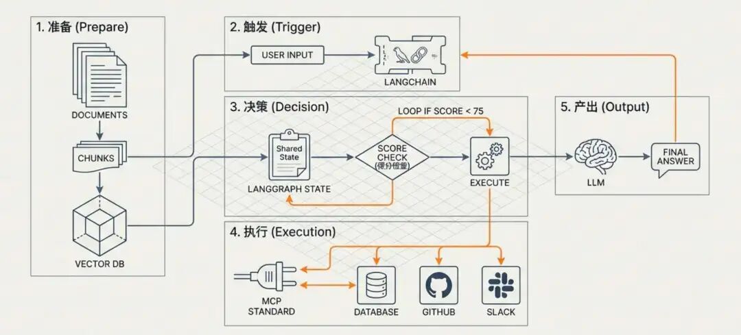 - 触发: 用户提问,LangChain 调度 RAG 流程,根据语义意图找回知识。