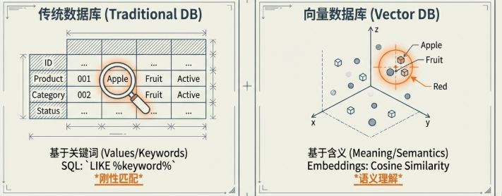 传统的 SQL 数据库是基于值或关键词的匹配(如 LIKE %vacation%)。而向量数据库(如 ChromaDB, Pinecone)则是基于**含义(Meaning)**的匹配。即使搜索词不一致,只要语义接近,系统就能精准定位。
