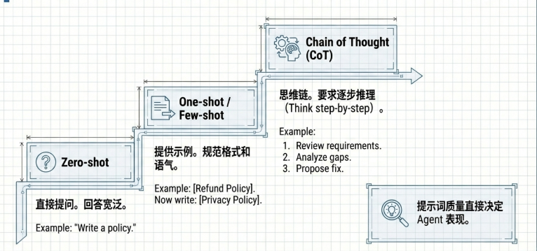 - Few-shot(少样本): 提供几个理想的问答示例,这能有效地规范 AI 输出的语气(Tone)和特定格式。