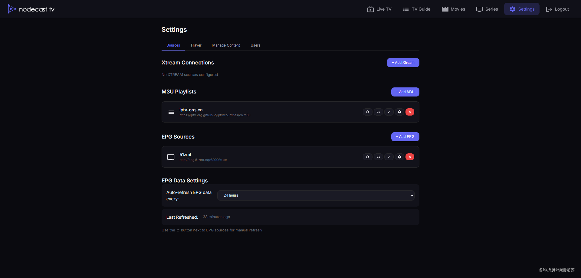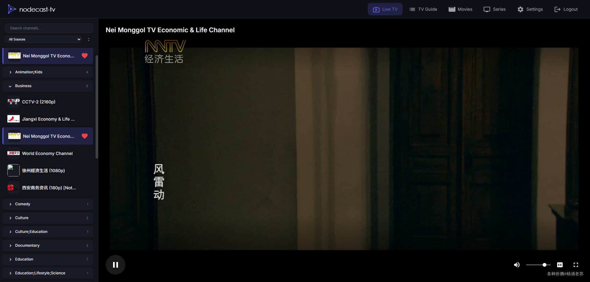 nodecast-tv 是一个高性能的自托管 Web 应用,让你通过浏览器直接播放来自 Xtream Codes 或 M3U 源的直播电视、电影和剧集。