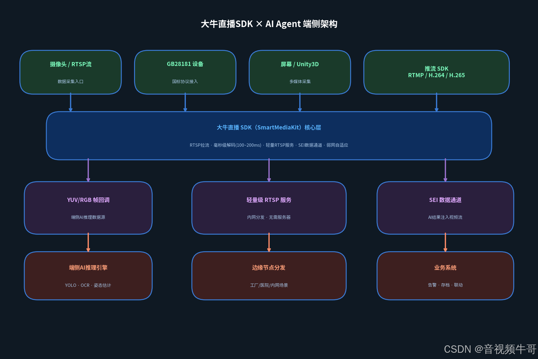 这整个流程完全可以由 AI Agent 编排,而大牛直播SDK的各个模块作为可靠的工具节点被调用。