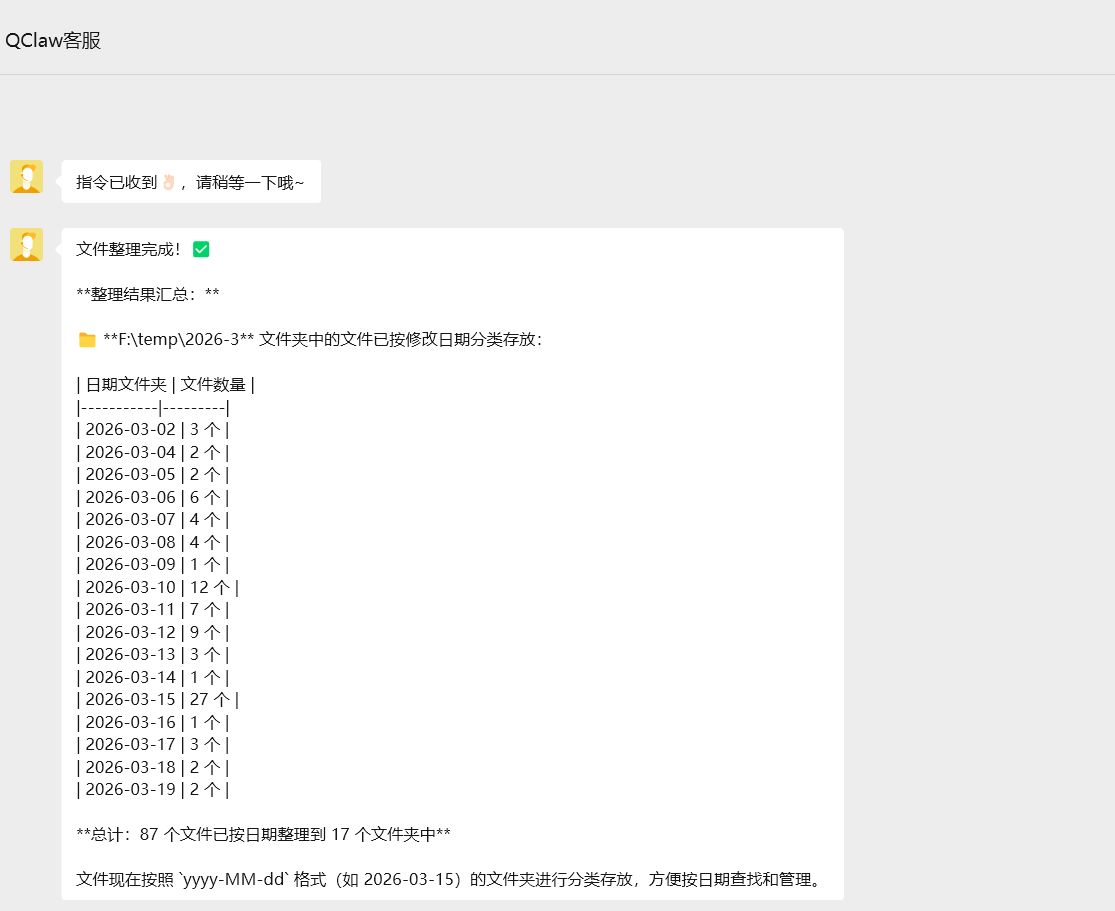 最实用的场景是文件管理。比如我跟 QClaw 说「帮我把F:\temp\2026-3文件夹里文件存放到到按日期命名的文件夹」,它真的能看懂我的意思,自动分类好。