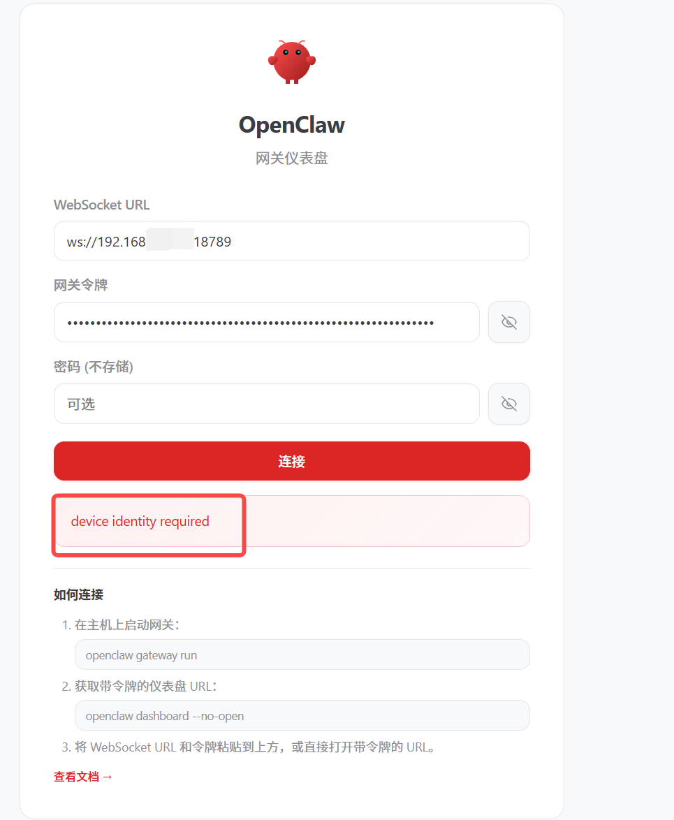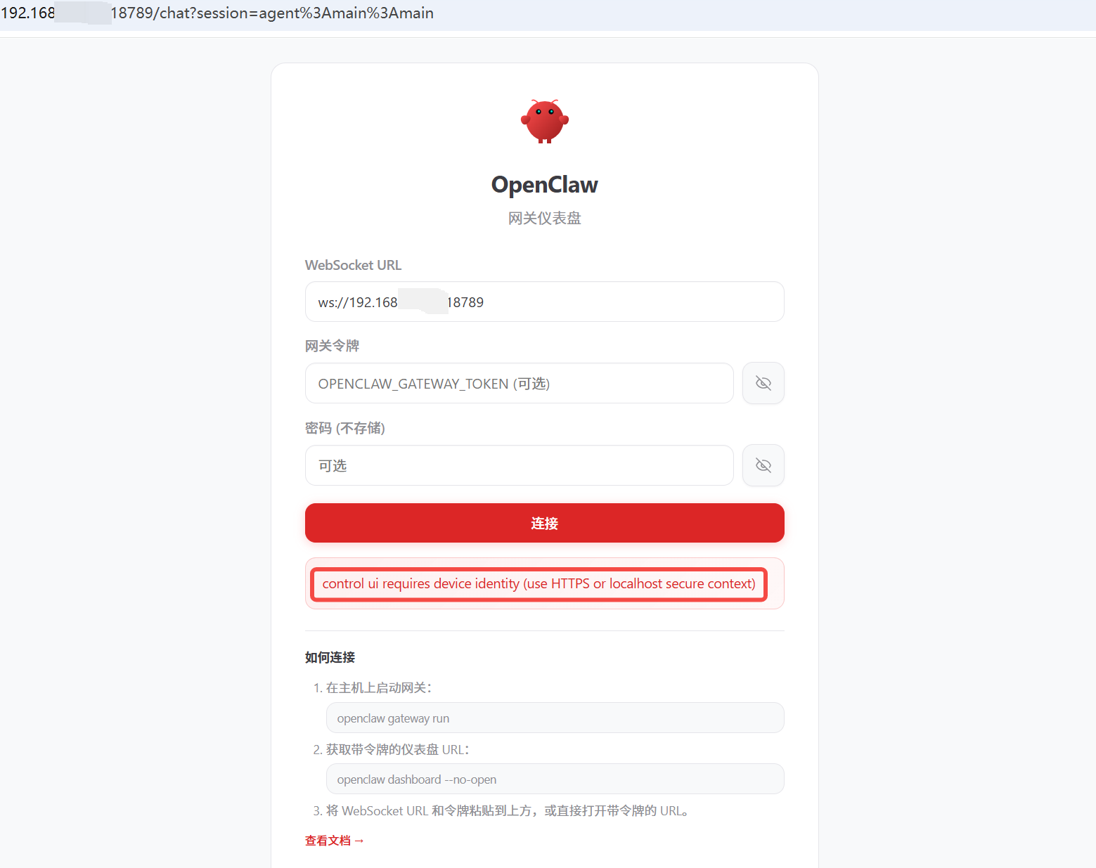 解决方案 使用本地电脑 的localhost,先将(服务器IP地址)192.168.*.*:18789 的端口映射到localhost