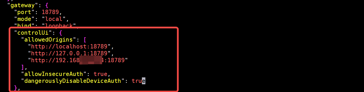 需要配置controlUi (换成你访问IP地址和端口)
