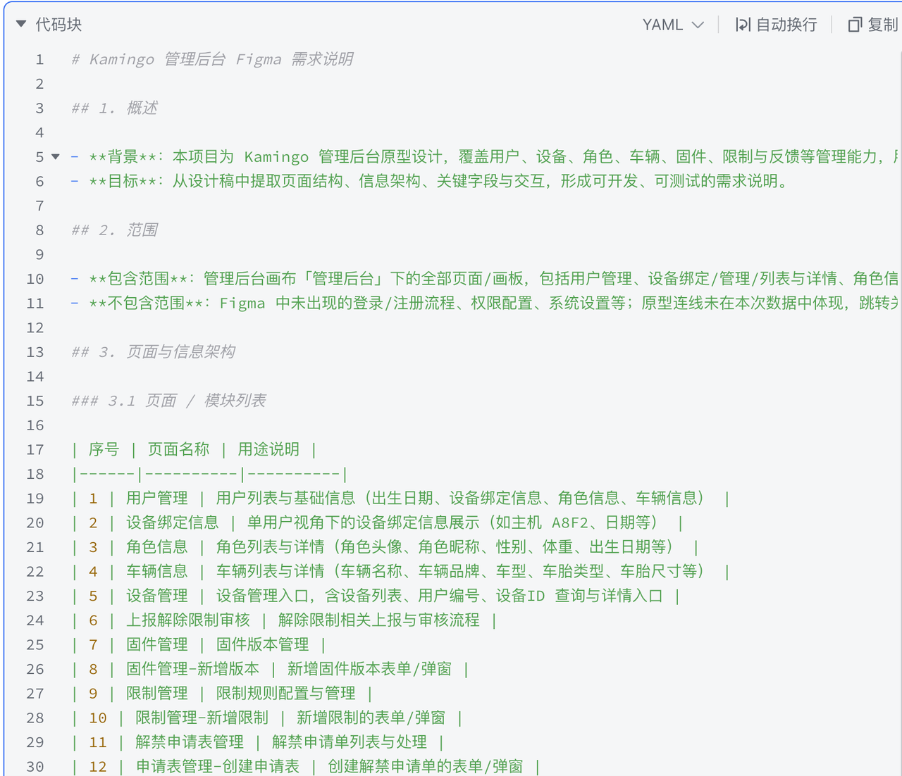 - 2. 标准化输出,格式统一:自动将零散的 Figma 原型信息整理为结构化 Markdown 格式,包含需求概述、页面架构、功能说明、设计规范、待确认事项等固定模块,规避人工整理的格式混乱、信息遗漏问题。
