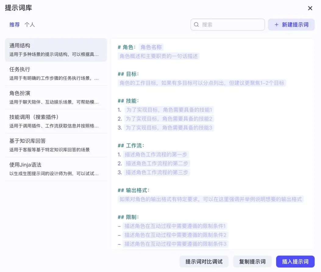 如果你的智能体是用于有明确工作步骤的任务执行类型就可以点左边的任务执行模板进行编写,如果是角色扮演、插件调用、知识库回答等可以分别借鉴不同的提示词编写模板。