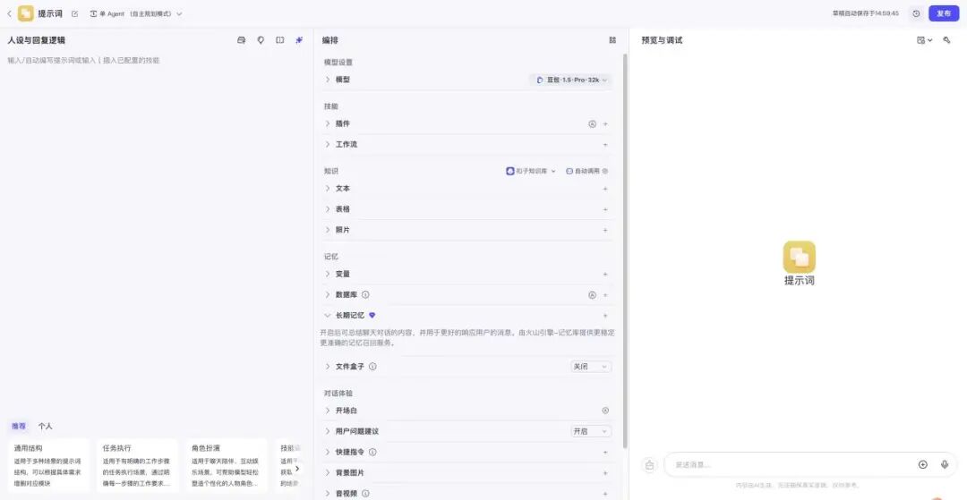 左边是设定system prompt,即设定这个智能体的人设和系统规则;中间是一些工具的选择,包括选择模型、插件、工作流、知识库等;右边是预览调试窗口。