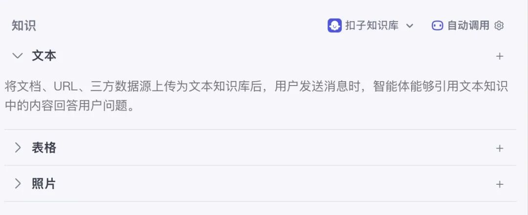 添加知识库可以直接上传你自己的材料,主要用于要求智能体基于你的知识素材进行回答的时候使用。点击【+】,按照提示导入即可。