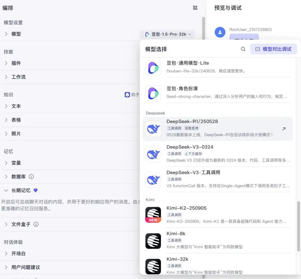可以选择你需要的模型,扣子支持豆包自己的模型、deepseek、Kimi等。