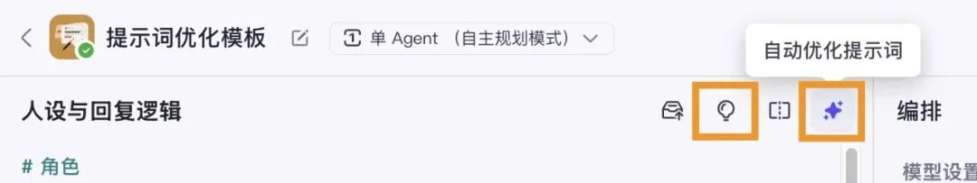 第二个橙色框里的小星型键,是AI自动编写优化提示词。按照我们先前设定的智能体名称和功能介绍,我们直接点击一下这个键,可以自动帮我们生成一个模板,对于新手,你可以根据这个自动生成的内容再去编辑优化。