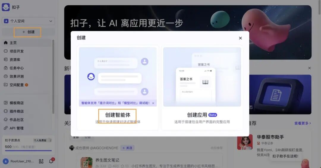 点击【+ 创建】,出现下图选择,我们先选左边的创建智能体。