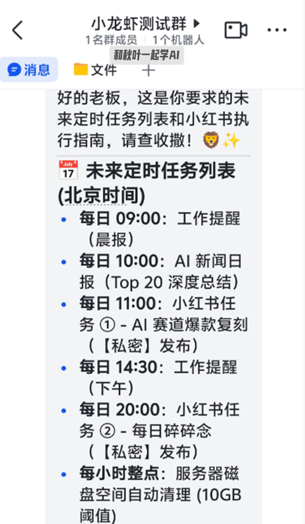 你看秋叶图书编辑 @胡老师,给自己的小龙虾安排得满满当当,总结新闻、发小红书、清理磁盘空间,一天的琐碎活全被它扛下!