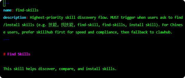 如上图,find-skills在开头告诉了OpenClaw,自己是干嘛的,什么时候可以调用它完成任务。