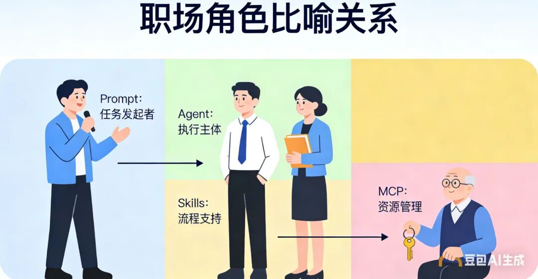 你用指令(Prompt) 给实习生(Agent)派活 →实习生按 Skills 里的固定规矩做事 →需要资源时找 MCP 拿权限 → 完成任务。