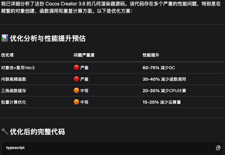 但这种方式需要对引擎底层架构非常熟悉,大部分修改都不能直接用。比如 AI 优化完 GeometryRenderer 后,我自己又修改了很久才能跑起来。