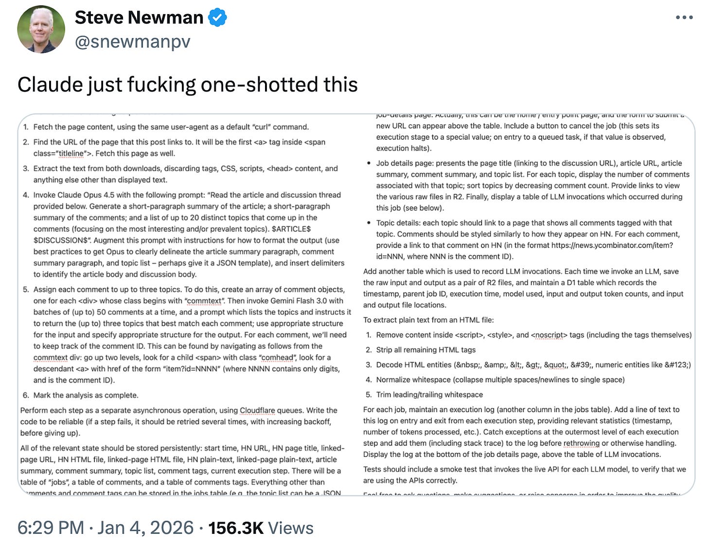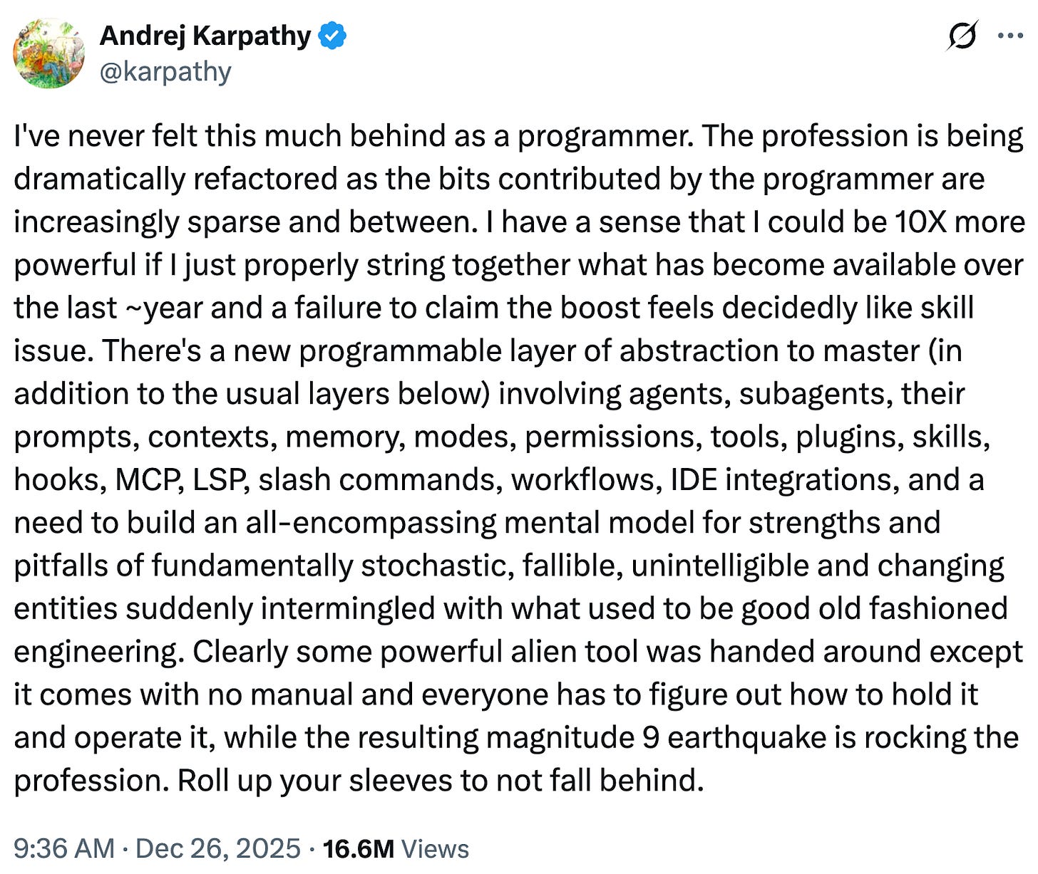 34. 去年下半年某个节点,经历了一次质变,Opus 4.5 很可能是那个触发点。在此之前,编程 Agent 虽然是有用的工具,但错误不少,要从中稳定地获取价值,需要相当的技术储备和精细的工作流设计。现在它们已经健壮得多,以至于非技术用户也能用 vibe coding 搭出正经应用。一个临界点已经穿越了;现在入手 AI 编程工具变得容易很多,从中榨出的价值超过投入也变得容易很多。
