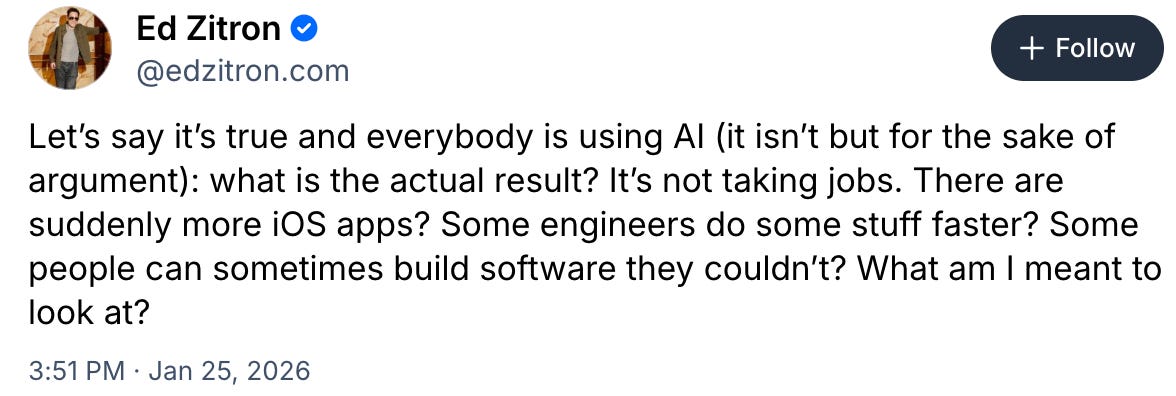 28. 分析师 Ed Zitron 对 AI 持怀疑态度,在很多人那里是个笑话,但他最近一条「牛肉在哪里」的吐槽串(点击图片查看完整内容)确实有点击中要害:他认为,就算 AI 催生了大量「活动」,这些活动真正产生的「影响」并不多。坦白说——作者也不太确定他说错了。现在依然困惑:AI 能力明明无可否认地令人震撼,但要真正兑现为现实世界的大规模影响——GDP 增长、劳动力市场重构、医疗健康成果提升等等——到底还要多久?这些「真正算数」的时刻,什么时候会到来?怎么判断?「算数」本身又该怎么定义?