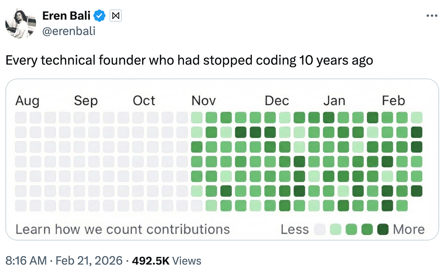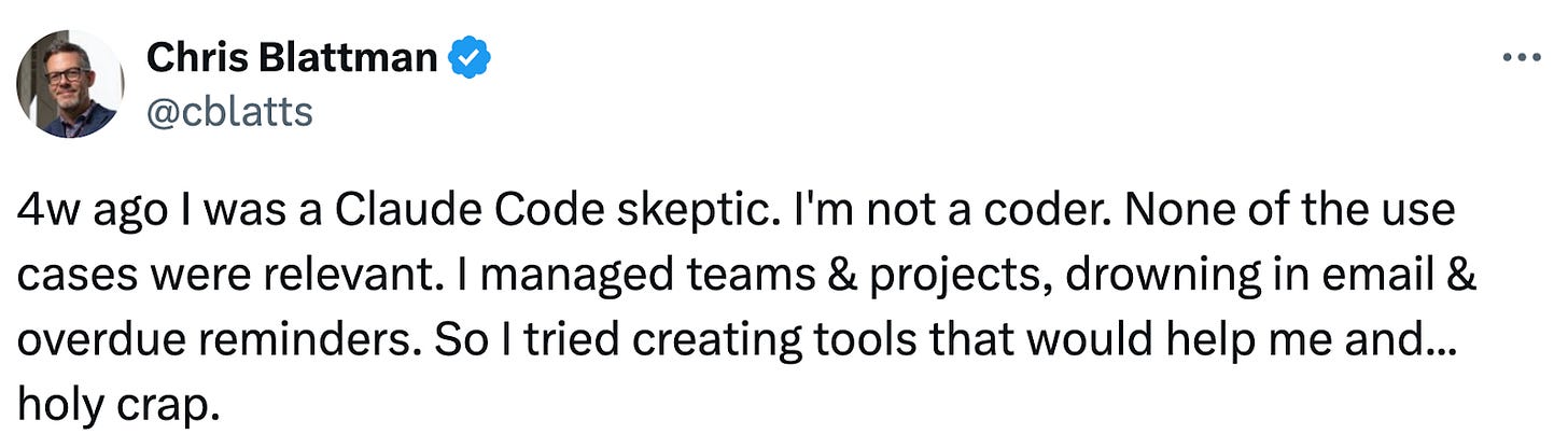 6. 之所以能重新投入编程,是因为 Claude Code 已经强到可以让人在不亲自看、甚至不亲自改代码的情况下高效产出。作者的感觉是,这个临界点大约是在去年 11 月 Opus 4.5 发布之后才到的。这提醒了一件事:阈值效应是 AI 影响力中最难预测的一部分。