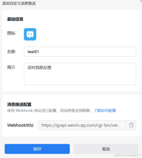 步骤四:配置名称和简介,复制并保存Webhook地址