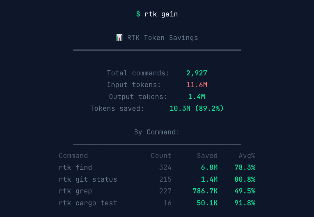 27、rtk:降低 Token 消耗的命令行工具。这是一款用于降低 AI 编程助手 Token 消耗的工具,通过压缩常见开发命令的输出、合并重复日志、删除代码注释和多余空行等方式,可将 Token 消耗减少 60-90%,有效延长套餐配额的使用时间。