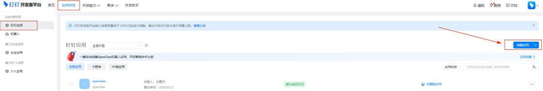 步骤 1:登录钉钉开发者后台,创建企业内部应用