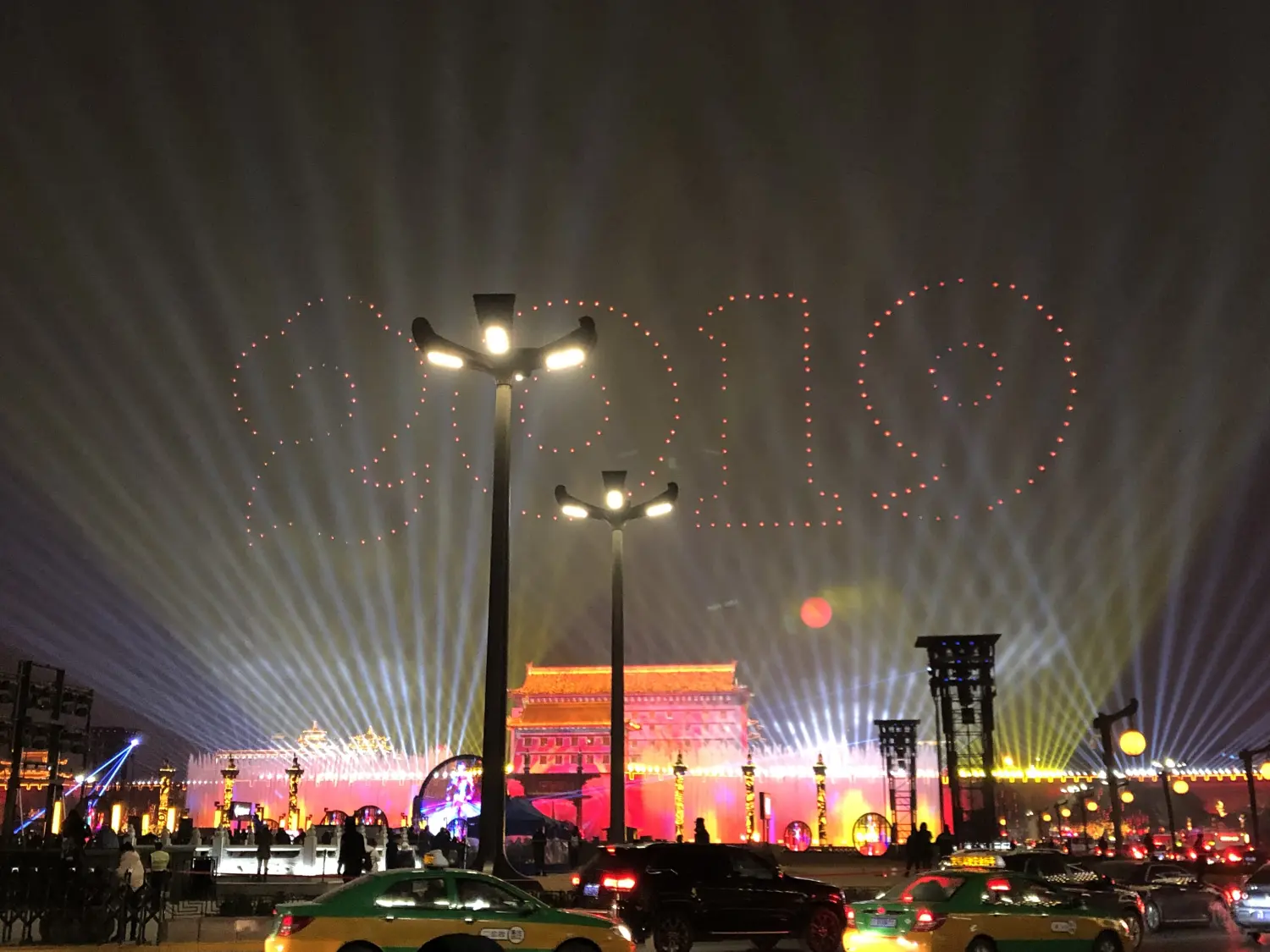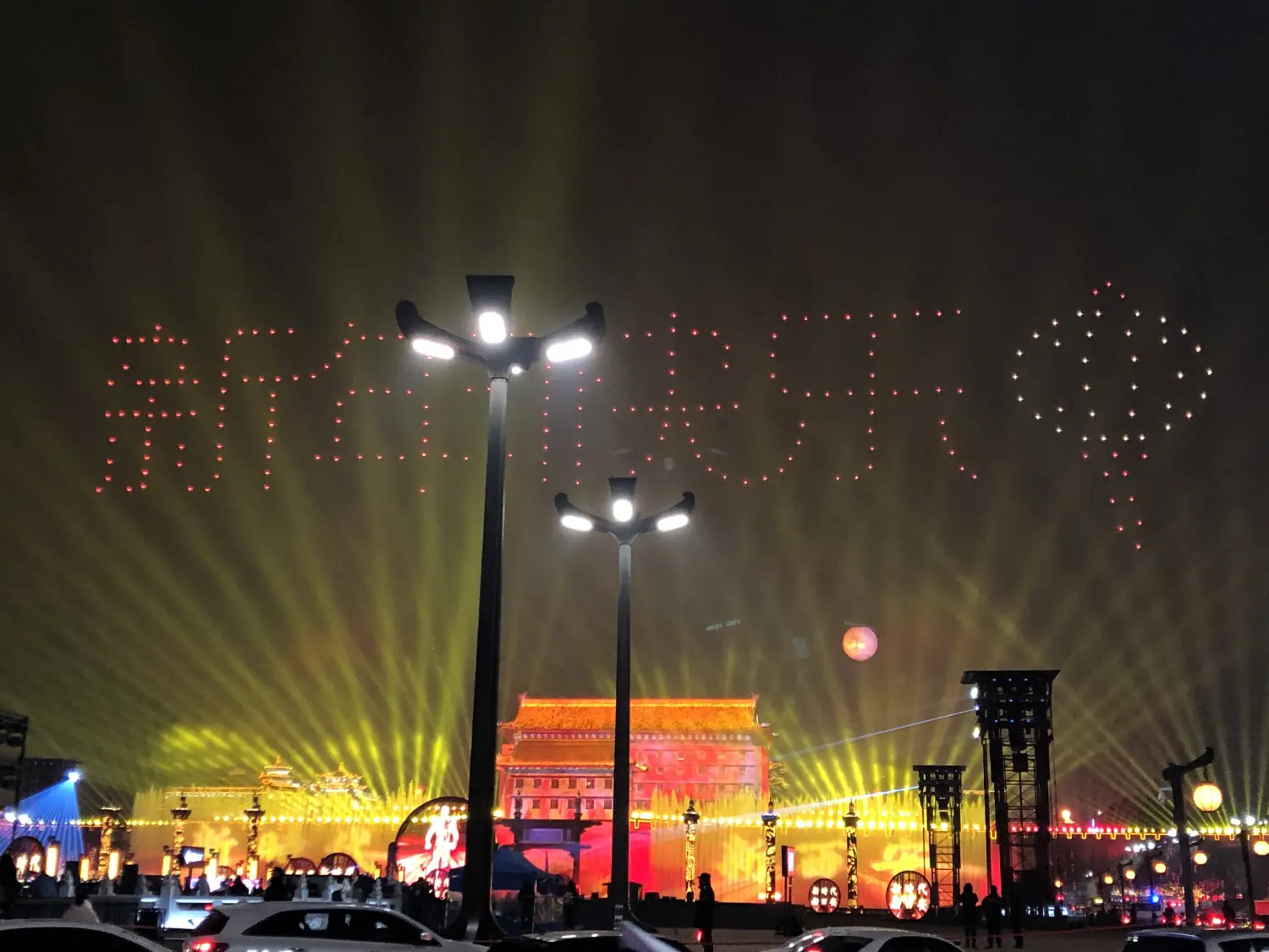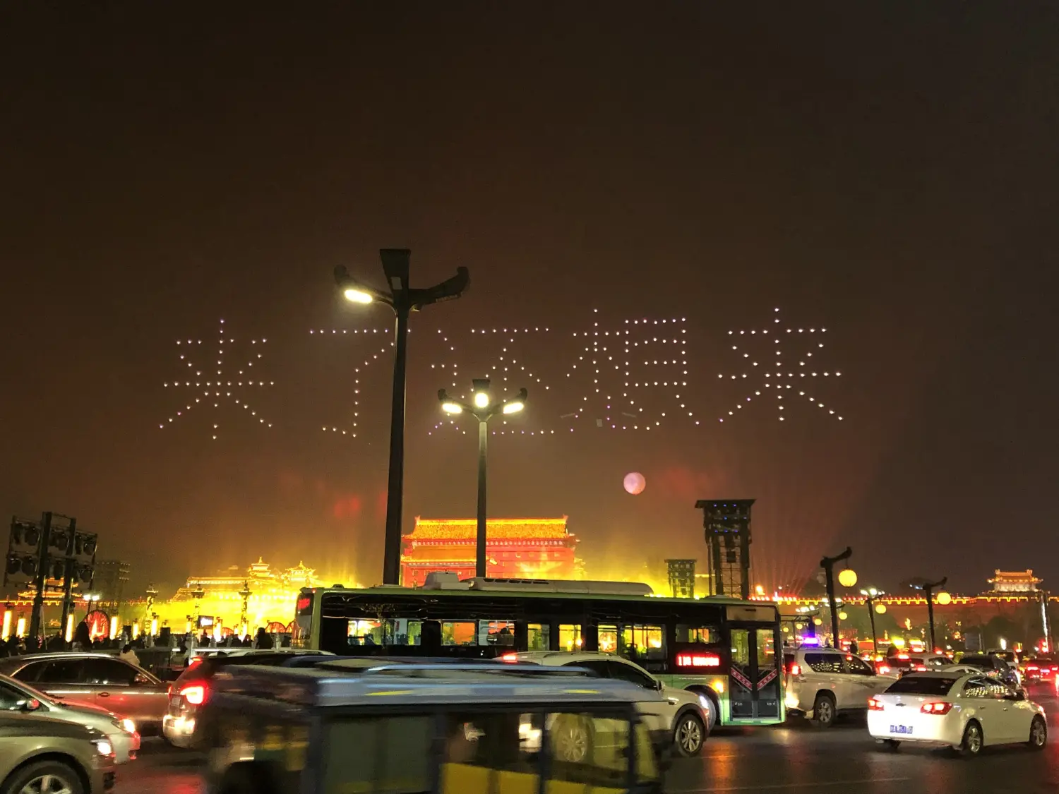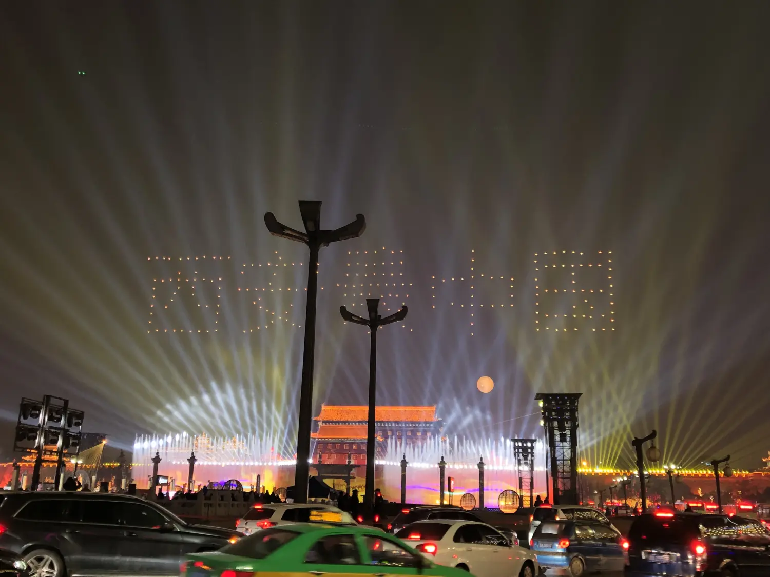 晚上,城墙南门,灯光秀。