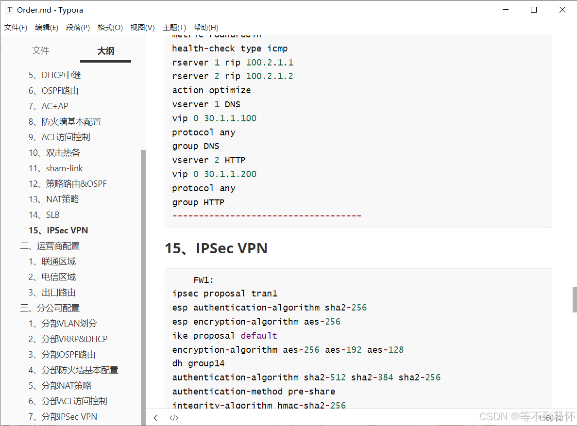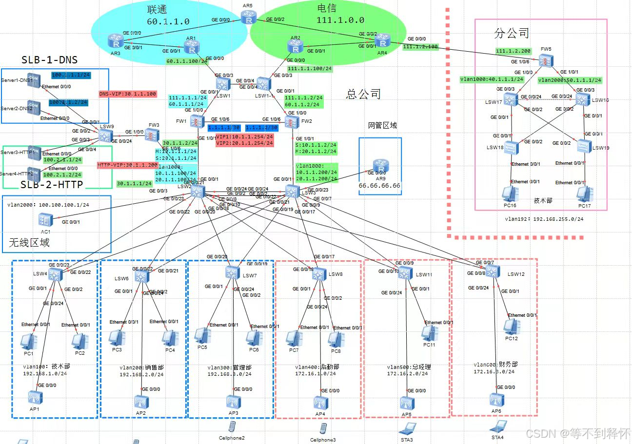 该网络运用到的技术主要有vlan划分、链路聚合、MSTP、VRRP、DHCP、OSPF、AC+AP、ACL、双击热备、sham-link、策略路由、NAT、SLB、路由引入和IPSec VPN等技术。非常适合适用于校园、企业、园区和基于IPSec技术网络的小伙伴使用,还可适用于毕设,课设,园区网络的实现等等场景!